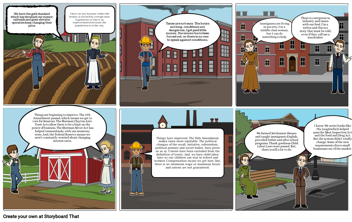 Things are beginning to improve. The 17th Amendment passed, which means we get to vote for Senators. The Sherman Clayton Anti-Trust Acts allow there to be a limit on the power of business. The Sherman Silver Act has helped tremendously with our monetary woes. And, the Federal Reserve means we aren't constantly worried about changing interest rates.