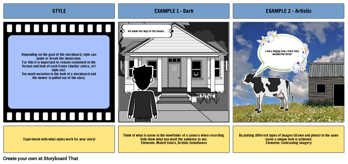 Depending on the goal of the storyboard, style can make or break the immersion. For this it is important to remain consistent in the format and look of each frame (similar colors, art style etc). Too much variation in the look of a storyboard and the viewer is pulled out of the story.