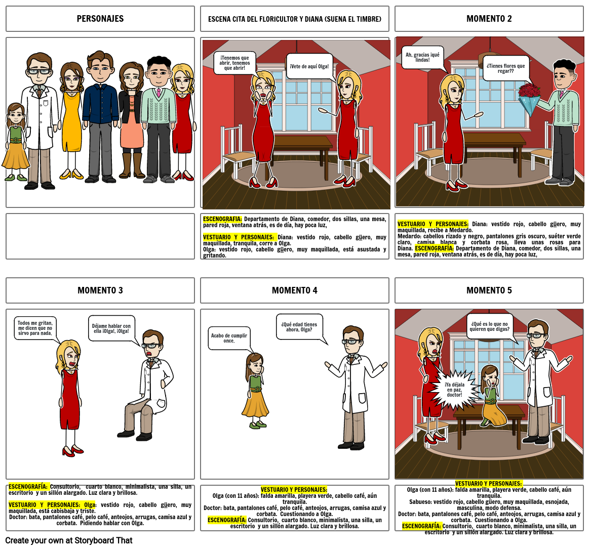 VESTUARIO Y PERSONAJES: Olga (con 11 años): falda amarilla, playera verde, cabello café, aún tranquila.Doctor: bata, pantalones café, pelo café, anteojos, arrugas, camisa azul y corbata. Cuestionando a Olga.ESCENOGRAFÍA: Consultorio, cuarto blanco, minimalista, una silla, un escritorio y un sillón alargado. Luz clara y brillosa.