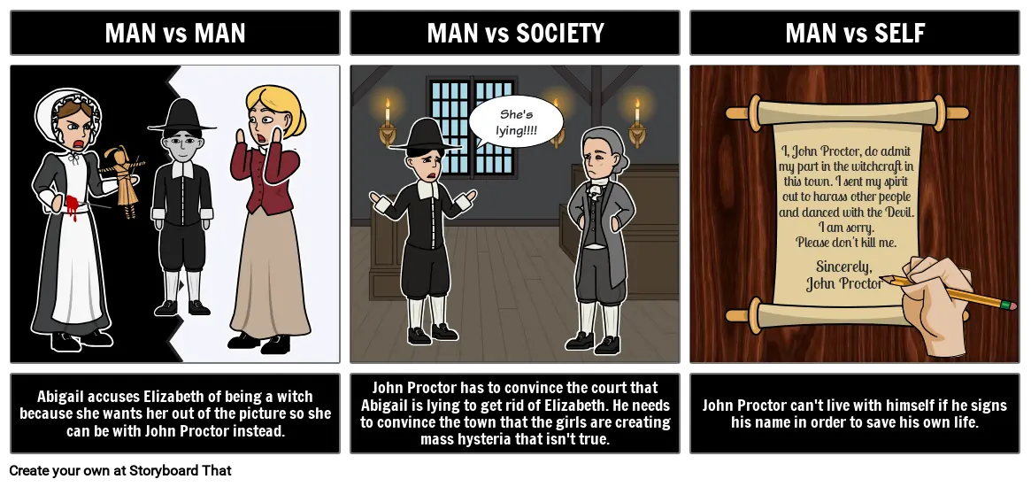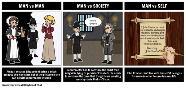 John Proctor, Abigail Williams, Reverend Hale ja kohtunik Danforth on mõned olulised tegelased, kes osalevad loo sisemistes ja välistes konfliktides. Kõik need tegelased kogevad sisemisi ja väliseid pingeid oma vaadete ning Salemi nõiaprotsesside ja süüdistuste tõttu. Samuti saavad õpilased võrrelda konflikte, mida inimesed kogesid Salemi nõiaprotsesside ajal ja konflikte, mida kogesid 1950. aastate kommunistliku jahi ajal.