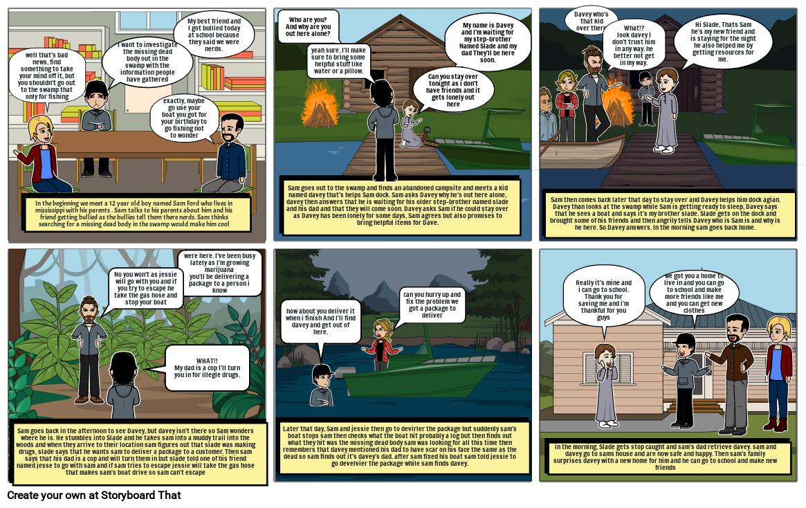 Sam then comes back later that day to stay over and Davey helps him dock agian. Davey than looks at the swamp while Sam is getting ready to sleep, Davey says that he sees a boat and says it's my brother slade. Slade gets on the dock and brought some of his friends and then angrily tells Davey who is Sam is and why is he here. So Davey answers. In the morning sam goes back home.