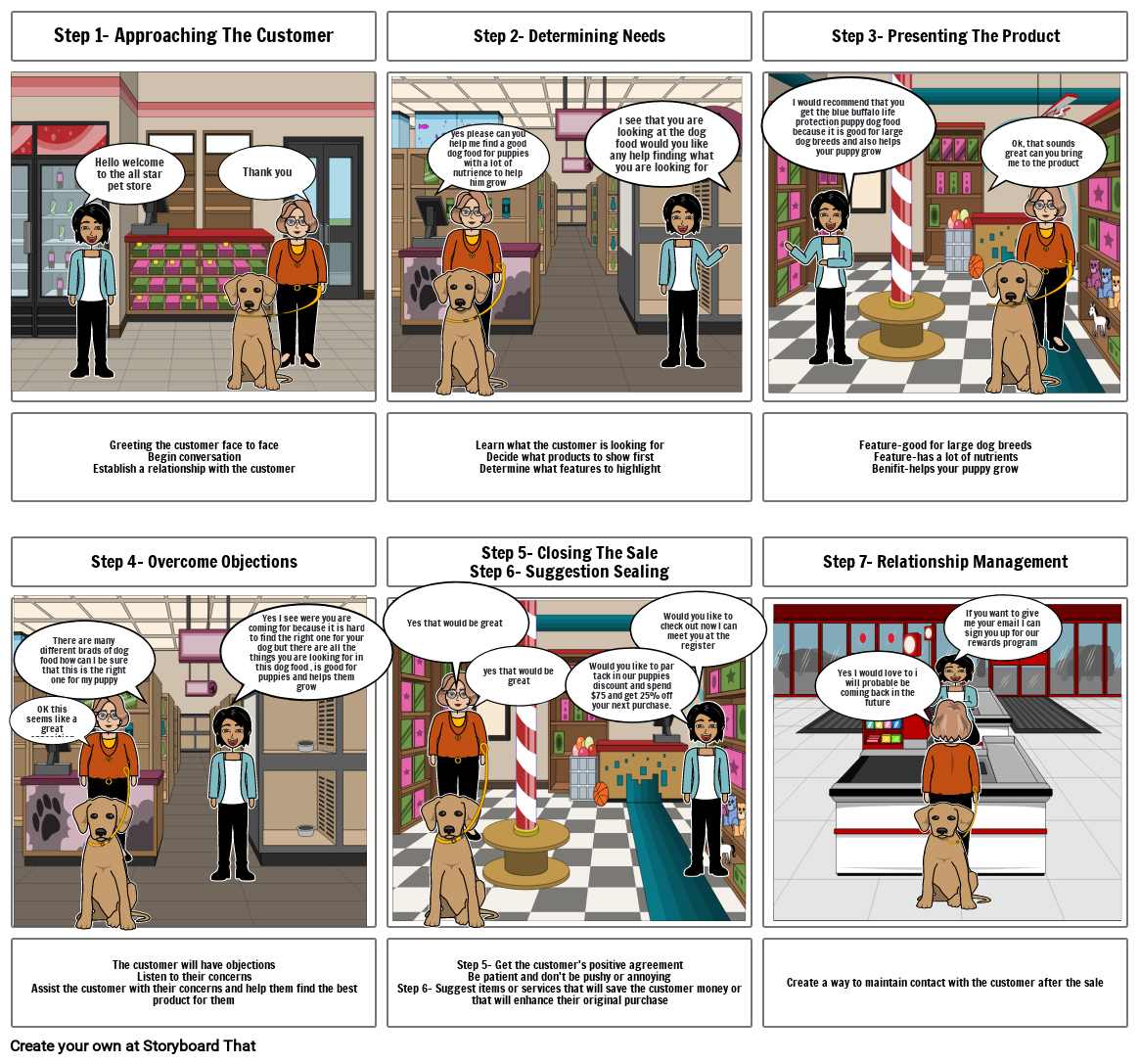 Step 5- Get the customer's positive agreementBe patient and don't be pushy or annoyingStep 6- Suggest items or services that will save the customer money or that will enhance their original purchase