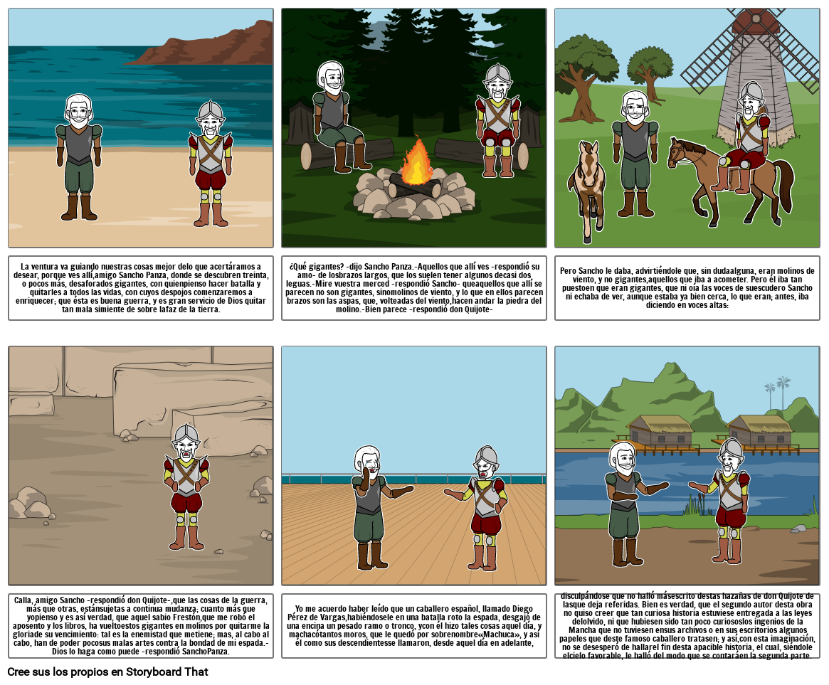 ¿Qué gigantes? -dijo Sancho Panza.-Aquellos que allí ves -respondió su amo- de losbrazos largos, que los suelen tener algunos decasi dos leguas.-Mire vuestra merced -respondió Sancho- queaquellos que allí se parecen no son gigantes, sinomolinos de viento, y lo que en ellos parecen brazos son las aspas, que, volteadas del viento,hacen andar la piedra del molino.-Bien parece -respondió don Quijote-