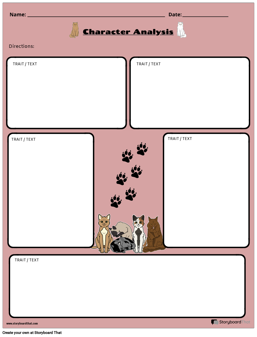 Работен лист за дигитален анализ на персонажи с котешка тема.