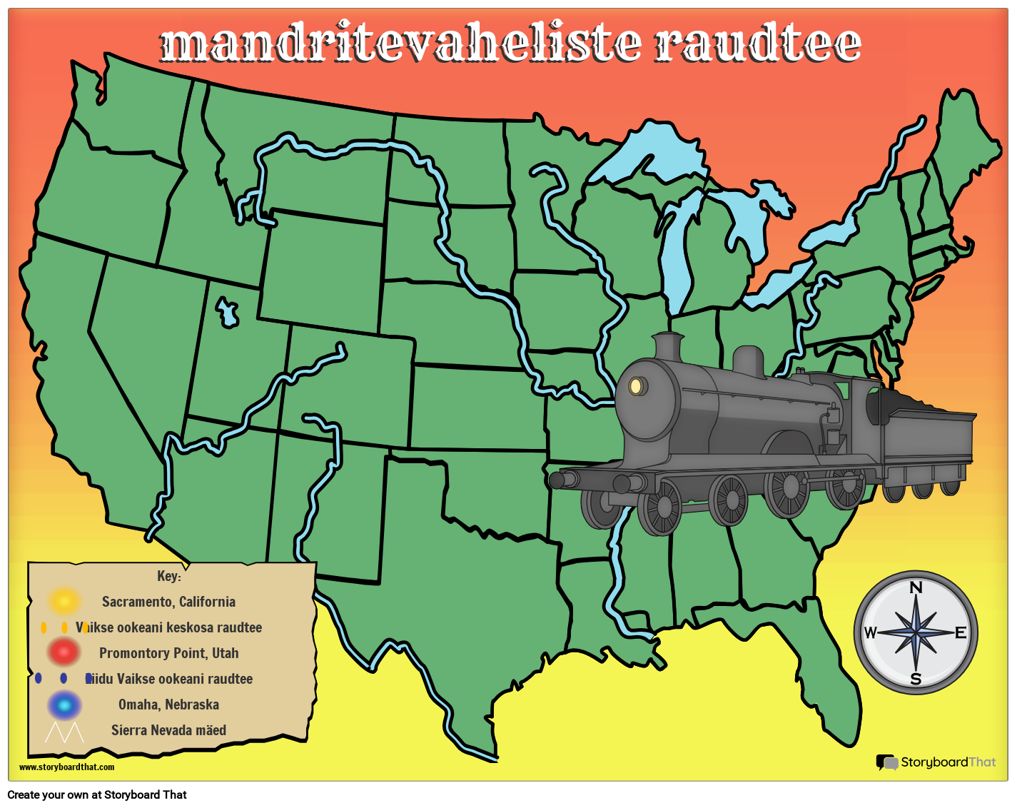 See kaardimall sisaldab võtmes sümboleid, mida õpilased saavad kopeerida ja kaardile õigesse kohta paigutada, et näidata oma arusaama sellest, kuhu Vaikse ookeani keskosa raudtee ja Union Pacific Railroad aastatel 1863-1869 oma rööbastee valmis ehitasid, lõpetades esimese mandritevahelise mandritevahelise raudtee.