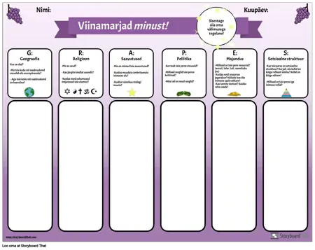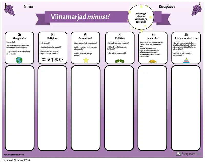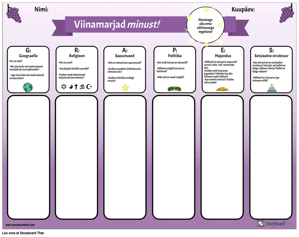Selle graafilise korraldaja abil saate oma õpilastele tutvustada akronüümi GRAPES. Õpilased vastavad iga kategooria küsimustele: geograafia, religioon, saavutused, poliitika, majandus ja sotsiaalne struktuur, mõtiskledes omaenda elu ja kogemuste üle. Pärast seda, kui neil on olnud võimalus mõtiskleda ja kirjutada, saavad õpetajad iga klassi kohta klassijuhatust juhtida. See on kasulik kogukonna loomise tegevus ja võimalus tutvustada seda lihtsat graafilist korraldajat, mida saab kasutada iga iidse tsivilisatsiooni uurimiseks.