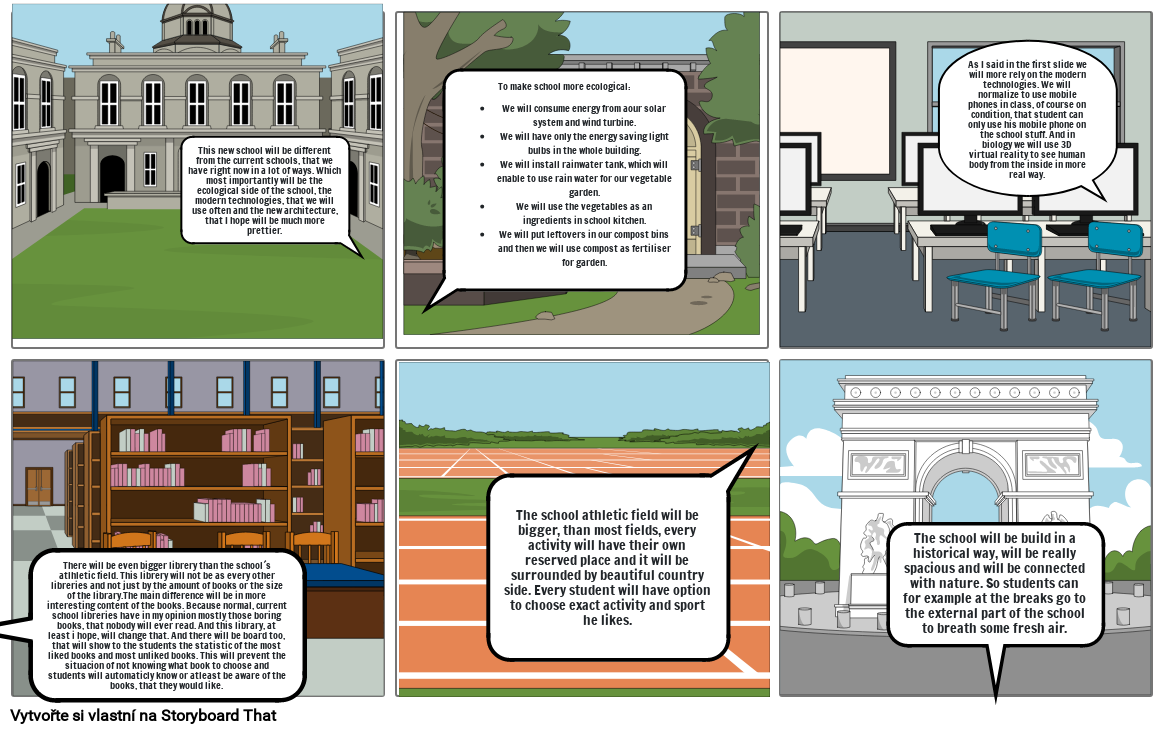 There will be even bigger librery than the school´s atlhletic field. This librery will not be as every other libreries and not just by the amount of books or the size of the library.The main difference will be in more interesting content of the books. Because normal, current school libreries have in my opinion mostly those boring books, that nobody will ever read. And this library, at least i hope, will change that. And there will be board too, that will show to the students the statistic of the most liked books and most unliked books. This will prevent the situacion of not knowing what book to choose and students will automaticly know or atleast be aware of the books, that they would like.