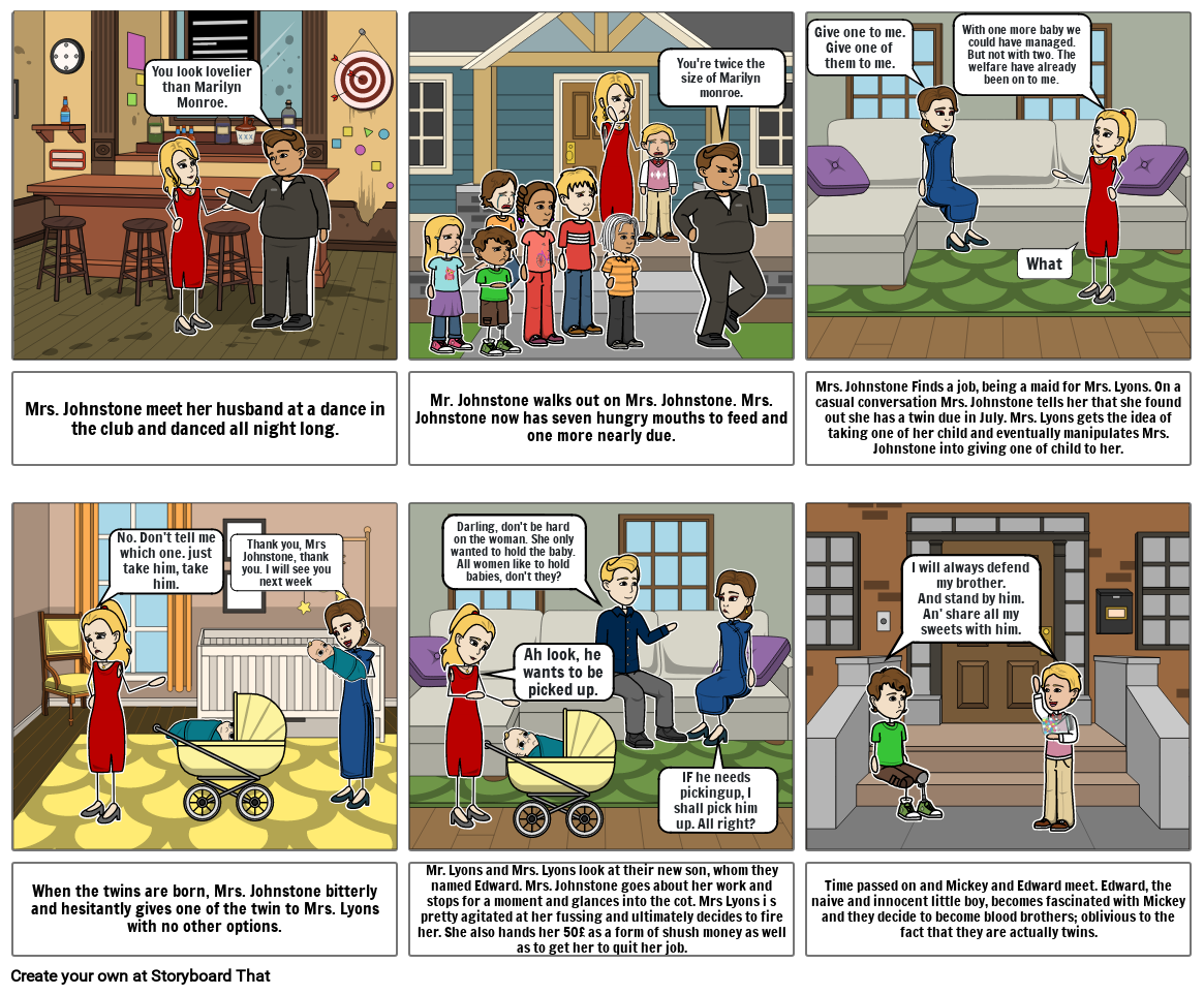 Mrs. Johnstone Finds a job, being a maid for Mrs. Lyons. On a casual conversation Mrs. Johnstone tells her that she found out she has a twin due in July. Mrs. Lyons gets the idea of taking one of her child and eventually manipulates Mrs. Johnstone into giving one of child to her.