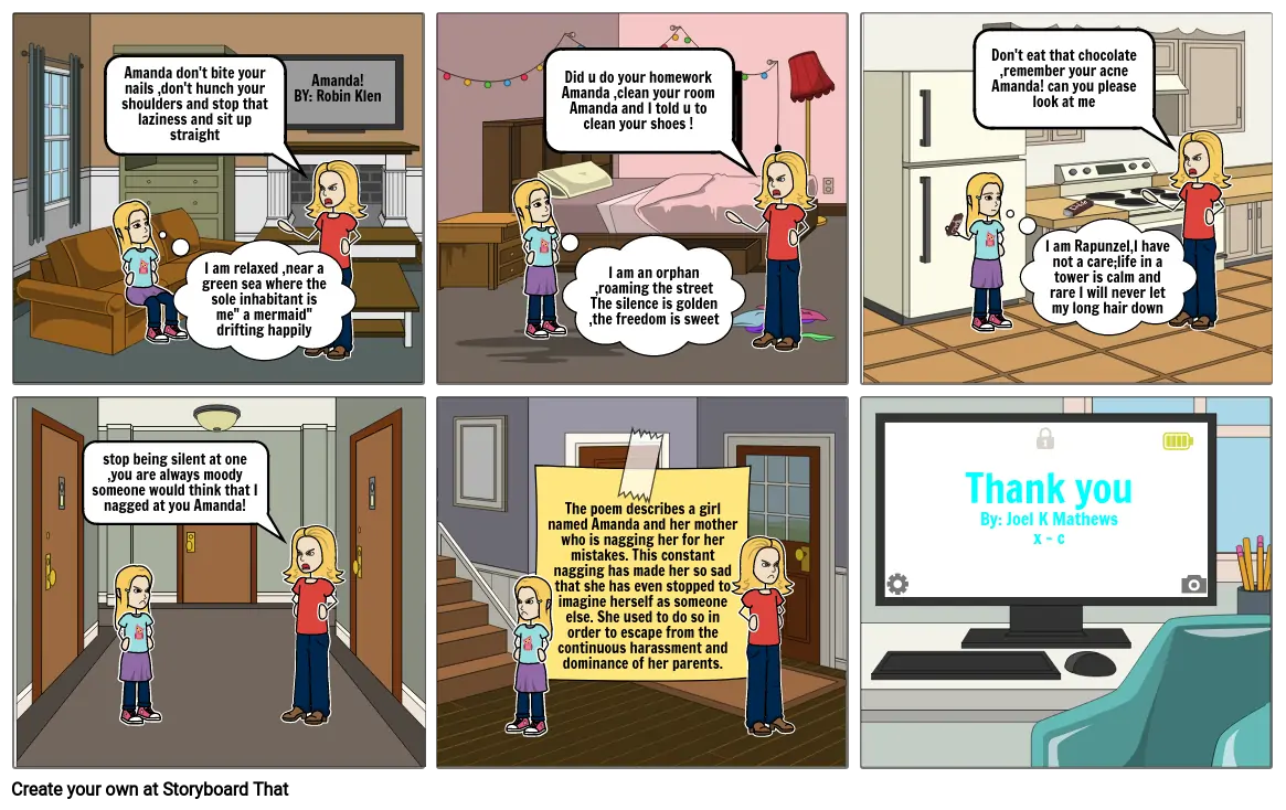 The poem describes a girl named Amanda and her mother who is nagging her for her mistakes. This constant nagging has made her so sad that she has even stopped to imagine herself as someone else. She used to do so in order to escape from the continuous harassment and dominance of her parents.