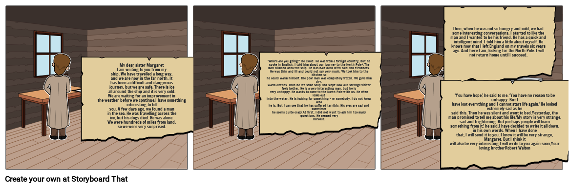 ‘You have hope,’ he said to me. ‘You have no reason to be unhappy. But Ihave lost everything and I cannot start life again.’ He looked extremely sad as hesaid this. Then he was silent and went to bed.Yesterday, the man promised to tell me about his life.‘My story is very strange, sad and frightening. But perhaps people will learnsomething from it,’ he said.I have decided to write it all down, in his own words. When I have donethat, I will send it to you. I know it will be very strange, Margaret. But I think itwill also be very interesting.I will write to you again soon,Your loving brotherRobert Walton