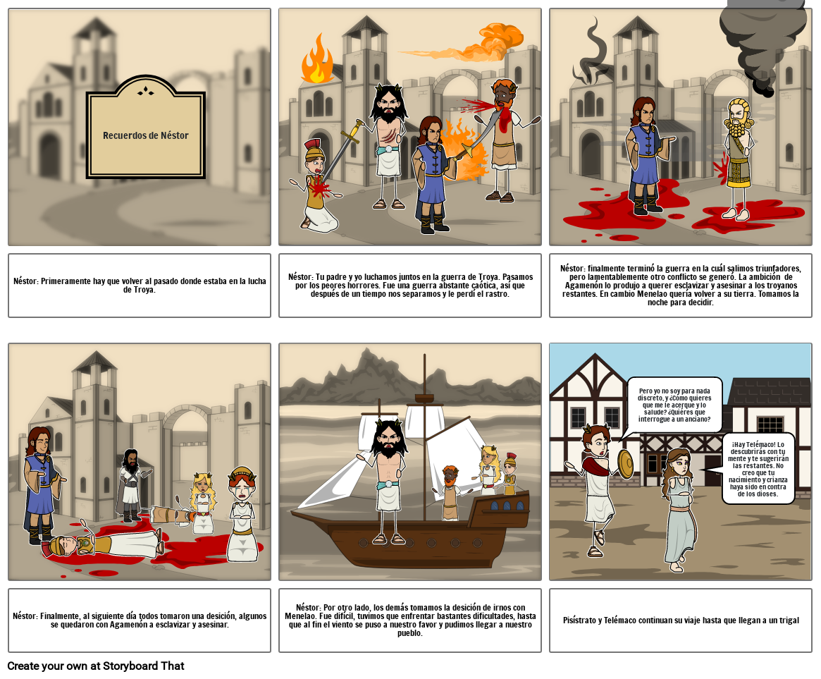 Néstor: finalmente terminó la guerra en la cuál salimos triunfadores, pero lamentablemente otro conflicto se generó. La ambición  de Agamenón lo produjo a querer esclavizar y asesinar a los troyanos restantes. En cambio Menelao quería volver a su tierra. Tomamos la noche para decidir.