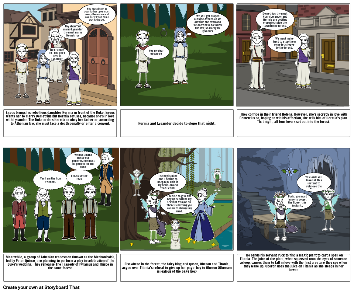 Egeus brings his rebellious daughter Hermia in front of the Duke. Egeus wants her to marry Demetrius but Hermia refuses, because she's in love with Lysander. The Duke orders Hermia to obey her father or, according to Athenian law, she must face a death penalty or enter a convent.