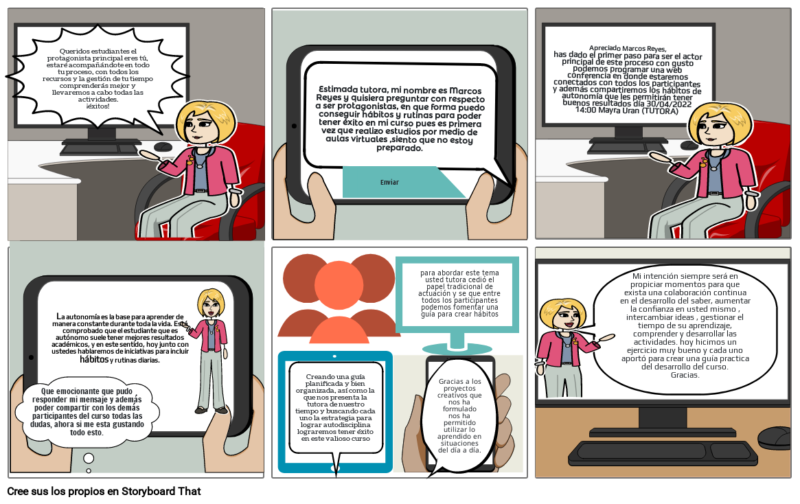 Apreciado Marcos Reyes,has dado el primer paso para ser el actor principal de este proceso con gusto podemos programar una web conferencia en donde estaremos conectados con todos los participantes y además compartiremos los hábitos de autonomía que les permitirán tener buenos resultados día 30/04/2022 14:00 Mayra Uran (TUTORA)