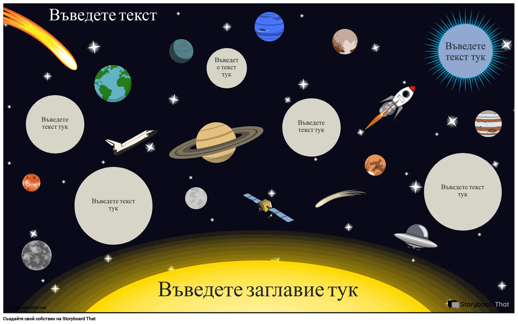 Научна инфографика с планети и космос, която визуално, кратко и креативно описва важните факти по дадена тема.