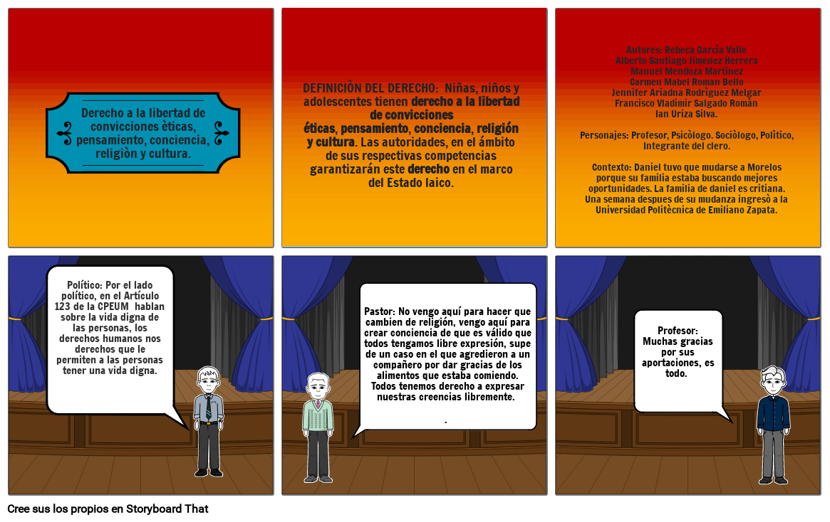 Autores: Rebeca Garcìa ValleAlberto Santiago Jimenez HerreraManuel Mendoza MartinezCarmen Mabel Roman BelloJennifer Ariadna Rodrìguez MelgarFrancisco Vladimir Salgado RomànIan Uriza Silva.Personajes: Profesor, Psicòlogo. Sociòlogo, Polìtico, Integrante del clero.Contexto: Daniel tuvo que mudarse a Morelos porque su familia estaba buscando mejores oportunidades. La familia de daniel es critiana.Una semana despues de su mudanza ingresò a la Universidad Politècnica de Emiliano Zapata.