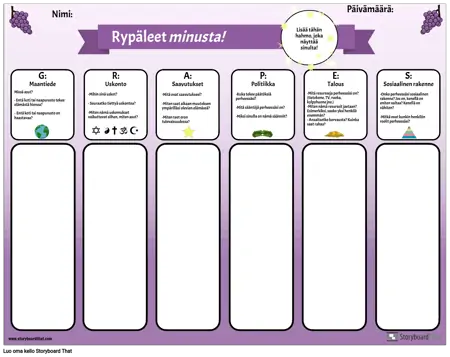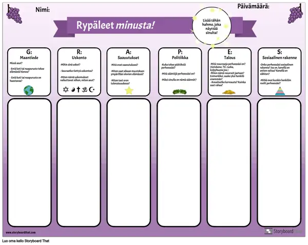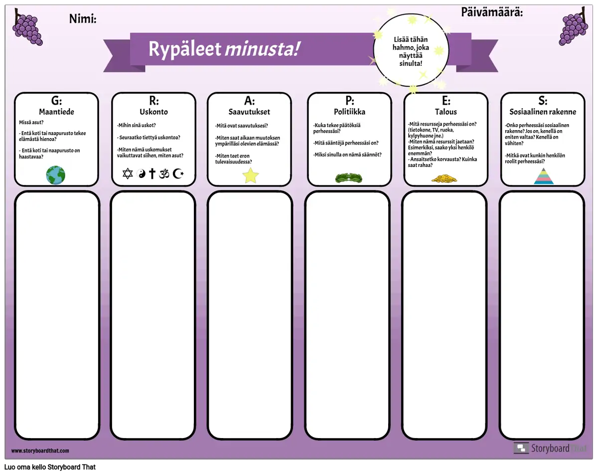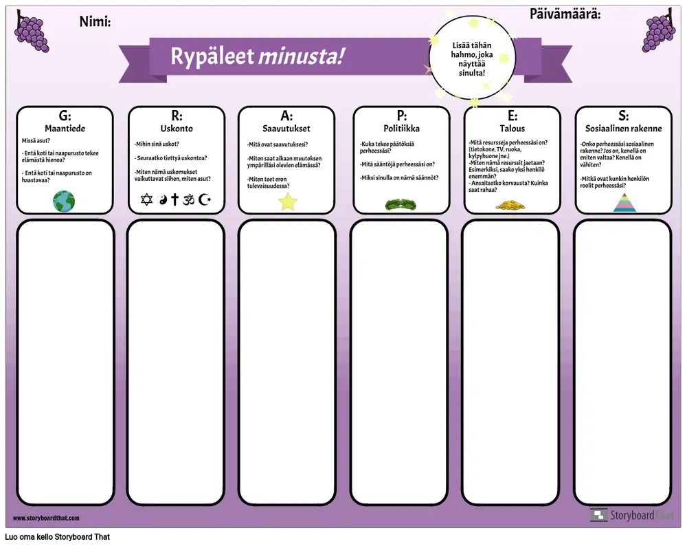 Tämän graafisen järjestäjän avulla voit esitellä lyhenteen GRAPES opiskelijoille. Opiskelijat vastaavat kunkin luokan kysymyksiin: maantiede, uskonto, saavutukset, politiikka, talous ja sosiaalinen rakenne pohtimalla omaa elämäänsä ja kokemuksiaan. Kun heillä on ollut mahdollisuus pohtia ja kirjoittaa, opettajat voivat johtaa luokan keskustelua kustakin luokasta. Tämä on hyödyllinen yhteisön rakentamisen aktiviteetti sekä tapa esitellä tämä yksinkertainen graafinen järjestäjä, jota voidaan käyttää jokaisen muinaisen sivilisaation tutkimiseen.