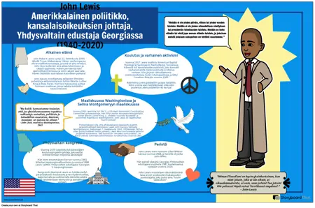 Aikainen elämä John Robert Lewis syntyi 21. helmikuuta 1940 lähellä Troya, Alabamassa. Hänen vanhempansa olivat osakkeenomistajia, ja työtä oli aina tehtävä. John löysi kuitenkin aina aikaa lukemiseen ja rakasti oppimista. Hänen perheensä kävi säännöllisesti kirkossa ja John rakasti saarnata. Hänen tiedettiin saarnaavan kanoilleen poikana! John kasvoi innoittamana sellaisten ihmisten puheista ja aktivismista kuin tohtori Martin Luther King ja Rosa Parks. Hän tiesi haluavansa auttaa luomaan maailman, jossa kaikkia kohdeltiin tasavertaisesti.