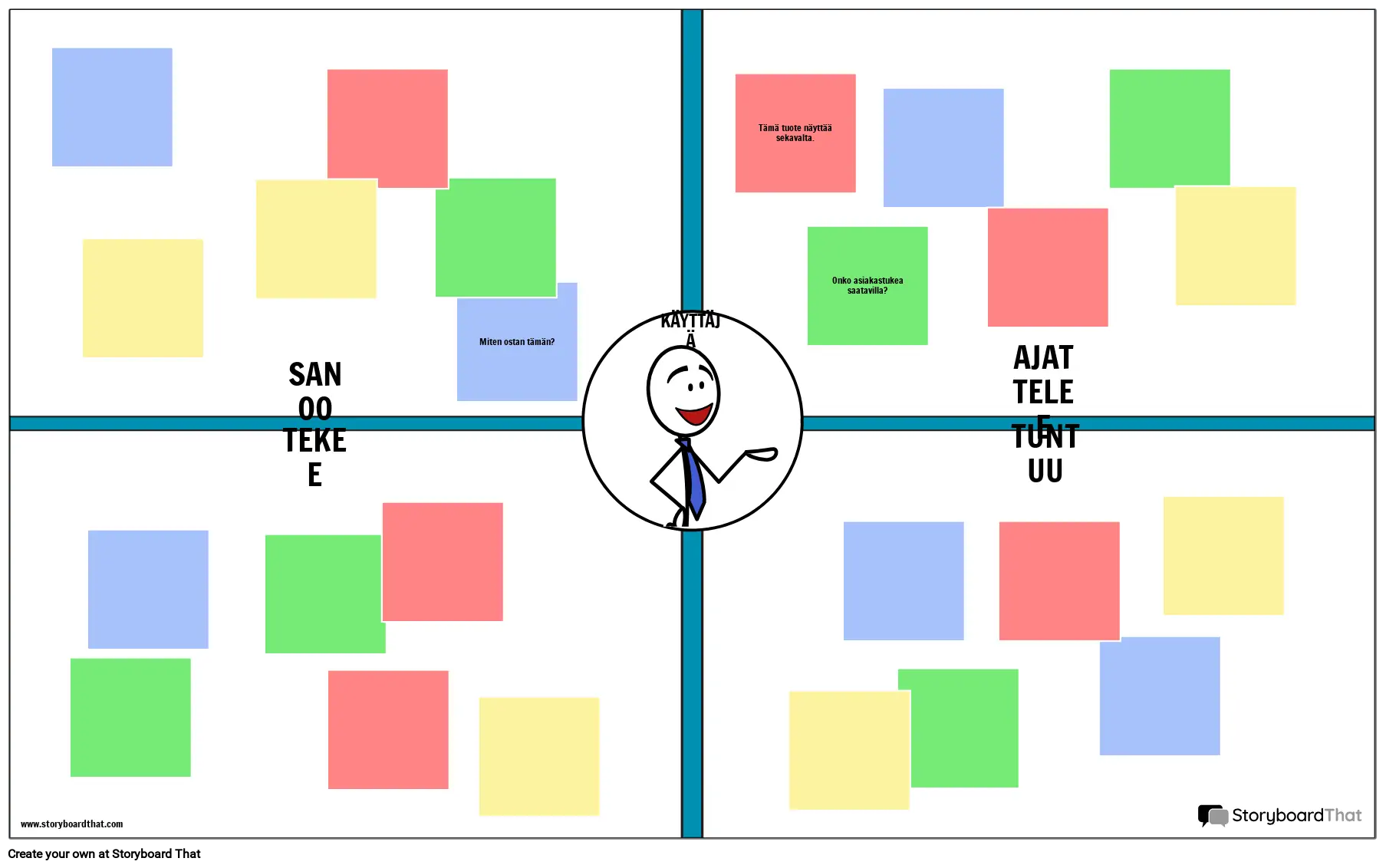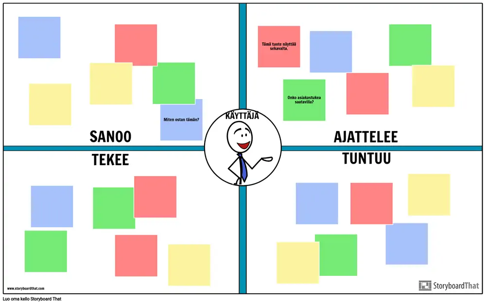 Käyttäjien empatia-kartta on visuaalinen työkalu tuotekehittäjille, joilla pyritään saamaan syvempi ja henkilökohtaisempi tietämys tietystä käyttäjien osajoukosta. Tavallinen käyttäjän empatia-kartta keskittyy siihen, mitä käyttäjä sanoo, ajattelee, tekee ja tuntee koko tuotteensa tai palveluprosessinsa yhteydessä. Tiimisi on luotava ja analysoitava käyttäjien empatiaa käsittelevät kartat, jotta päästäisiin yhteisymmärrykseen siitä, miten he uskovat käyttäjiensä reagoivan emotionaalisesti tiettyihin tuotteensa osa-alueisiin.