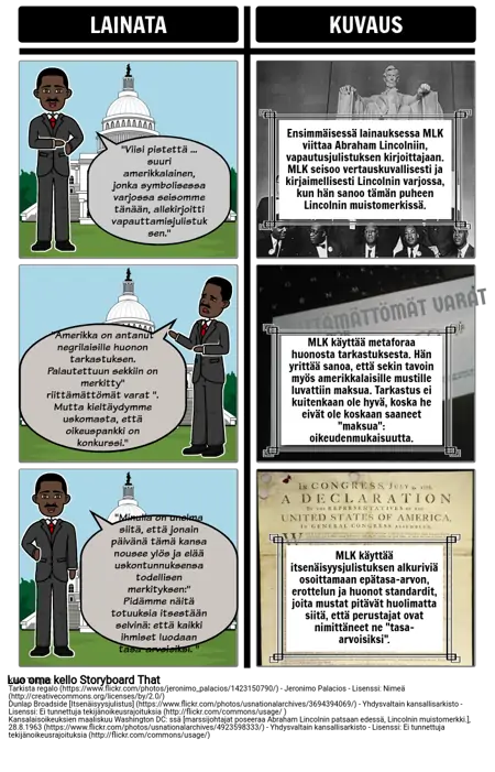 Ensimmäisessä lainauksessa MLK viittaa Abraham Lincolniin, vapautusjulistuksen kirjoittajaan. MLK seisoo vertauskuvallisesti ja kirjaimellisesti Lincolnin varjossa, kun hän sanoo tämän puheen Lincolnin muistomerkissä.