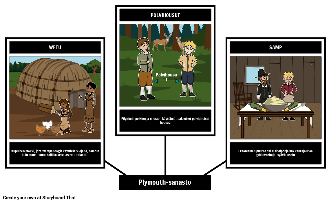 Luo visuaalinen sanastotaulu pyhiinvaeltajien ja Plymouthin siirtokuntaan liittyville avainsanatermeille