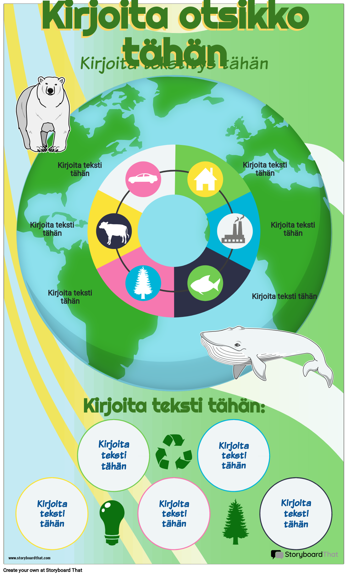 Pelasta maapallo tai auta planeettamme-aiheista tiedeinfografiaa, jota oppilaat voivat muokata kuvien ja tekstien avulla. Julisteet voidaan tulostaa ja ripustaa näkyvästi luokkahuoneessa tai ladata ja näyttää digitaalisesti.