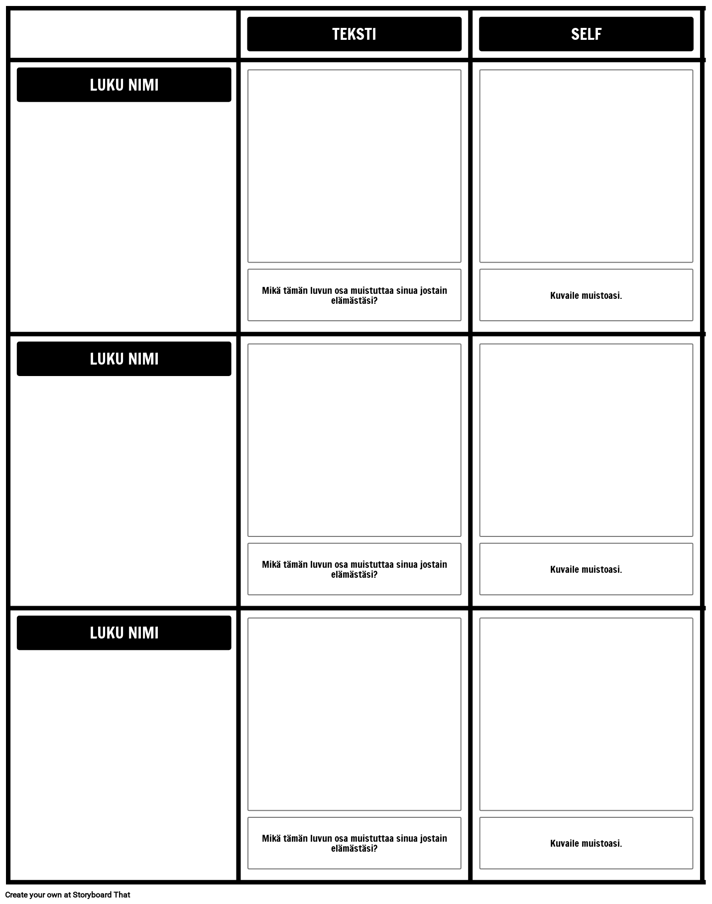 Teksti omaan yhteyteen -malli jokaiselle luvulle. Pyydä oppilaita tunnistamaan hetki tekstissä, johon he voivat henkilökohtaisesti muodostaa yhteyden