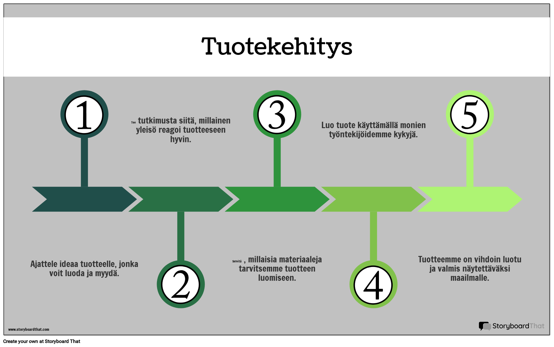 Ajattele ideaa tuotteelle, jonka voit luoda ja myydä. Tee tutkimusta siitä, millainen yleisö reagoi tuotteeseen hyvin. Selvitä , millaisia materiaaleja tarvitsemme tuotteen luomiseen. Luo tuote käyttämällä monien työntekijöidemme kykyjä. Tuotteemme on vihdoin luotu ja valmis näytettäväksi maailmalle.