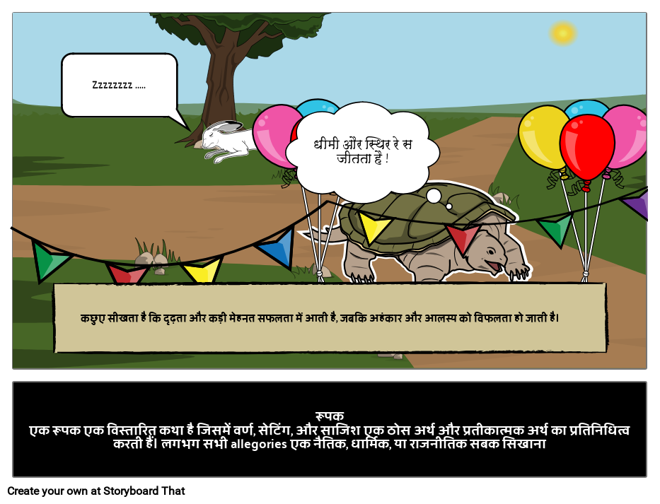 रूपकएक रूपक एक विस्तारित कथा है जिसमें वर्ण, सेटिंग, और साजिश एक ठोस अर्थ और प्रतीकात्मक अर्थ का प्रतिनिधित्व करती हैं। लगभग सभी allegories एक नैतिक, धार्मिक, या राजनीतिक सबक सिखाना