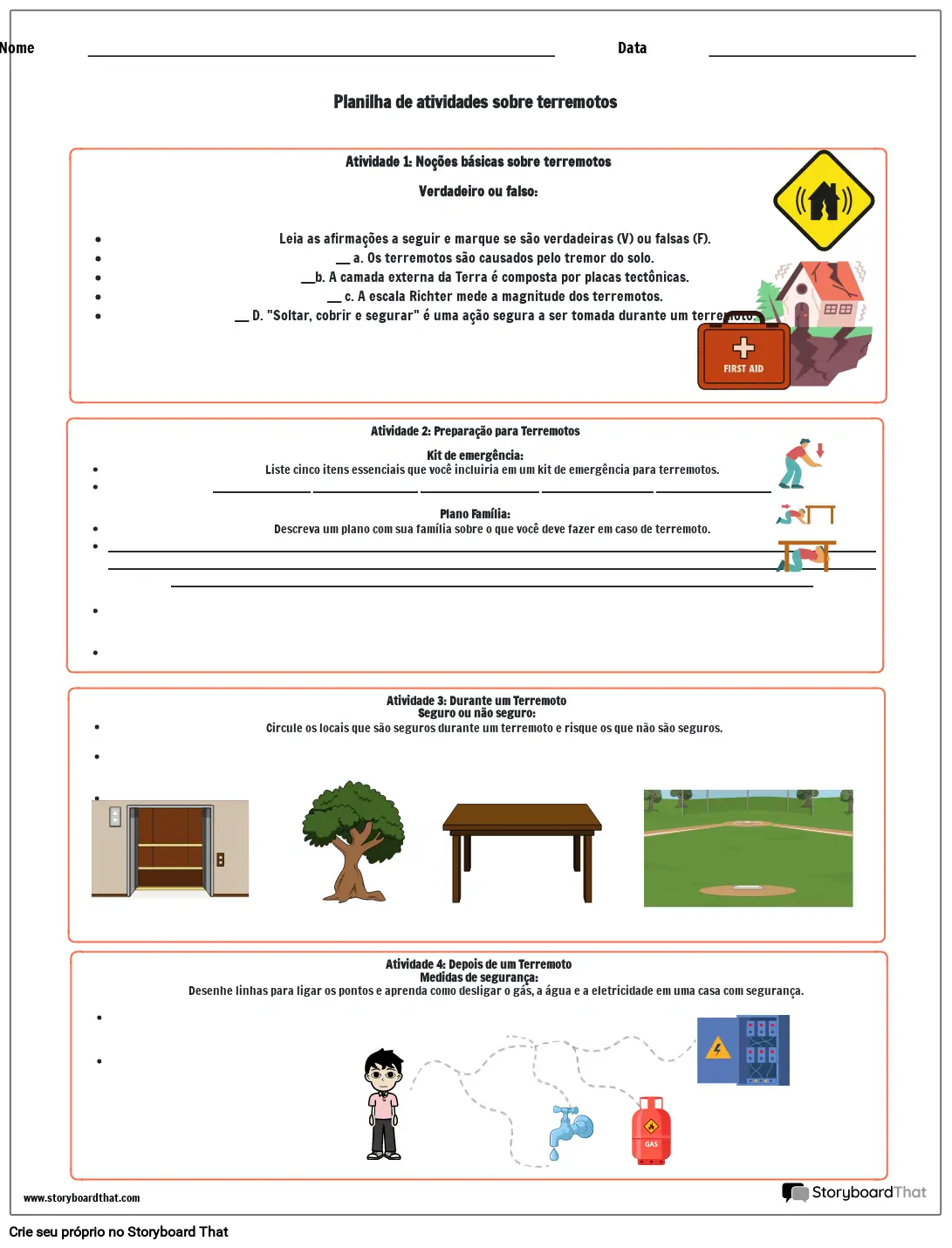 Atividade 1: Noções básicas sobre terremotos Verdadeiro ou falso: Leia as afirmações a seguir e marque se são verdadeiras (V) ou falsas (F). ____ a. Os terremotos são causados pelo tremor do solo. ____b. A camada externa da Terra é composta por placas tectônicas. ____ c. A escala Richter mede a magnitude dos terremotos. ____ D. "Soltar, cobrir e segurar" é uma ação segura a ser tomada durante um terremoto.
