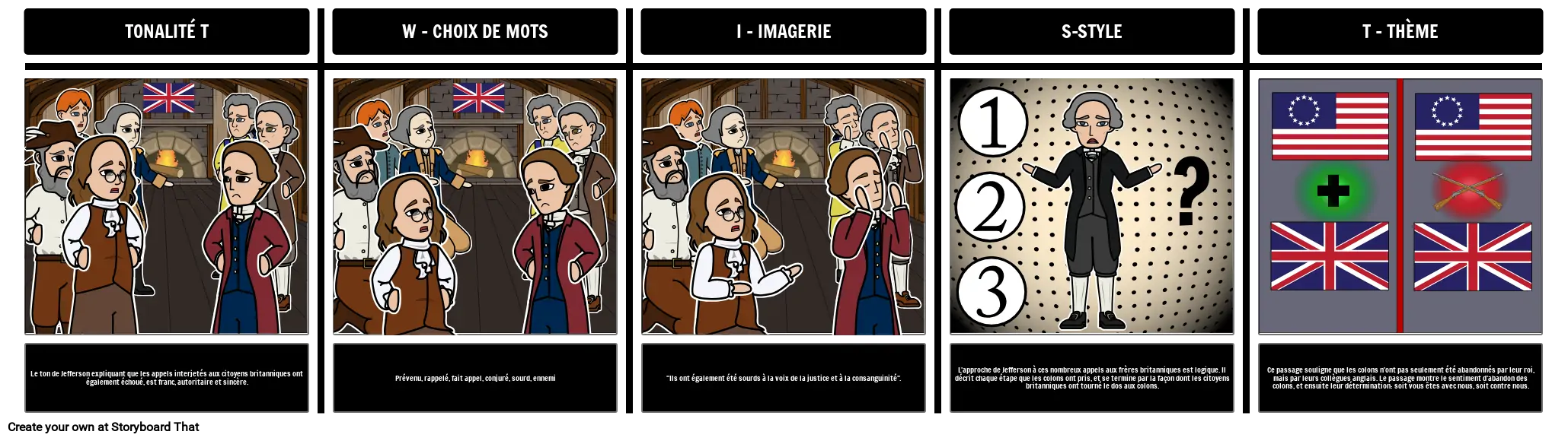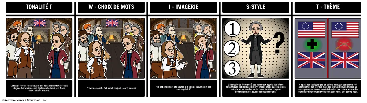 L'analyse TWIST est une méthode pour examiner le Ton, le Choix des Mots, l'Imagery, le Style et le Thème dans un texte. Lorsqu'elle est appliquée à la Déclaration d'Indépendance, elle aide les élèves à approfondir le langage de Jefferson et le but du document en décomposant ses éléments littéraires.