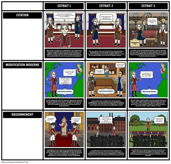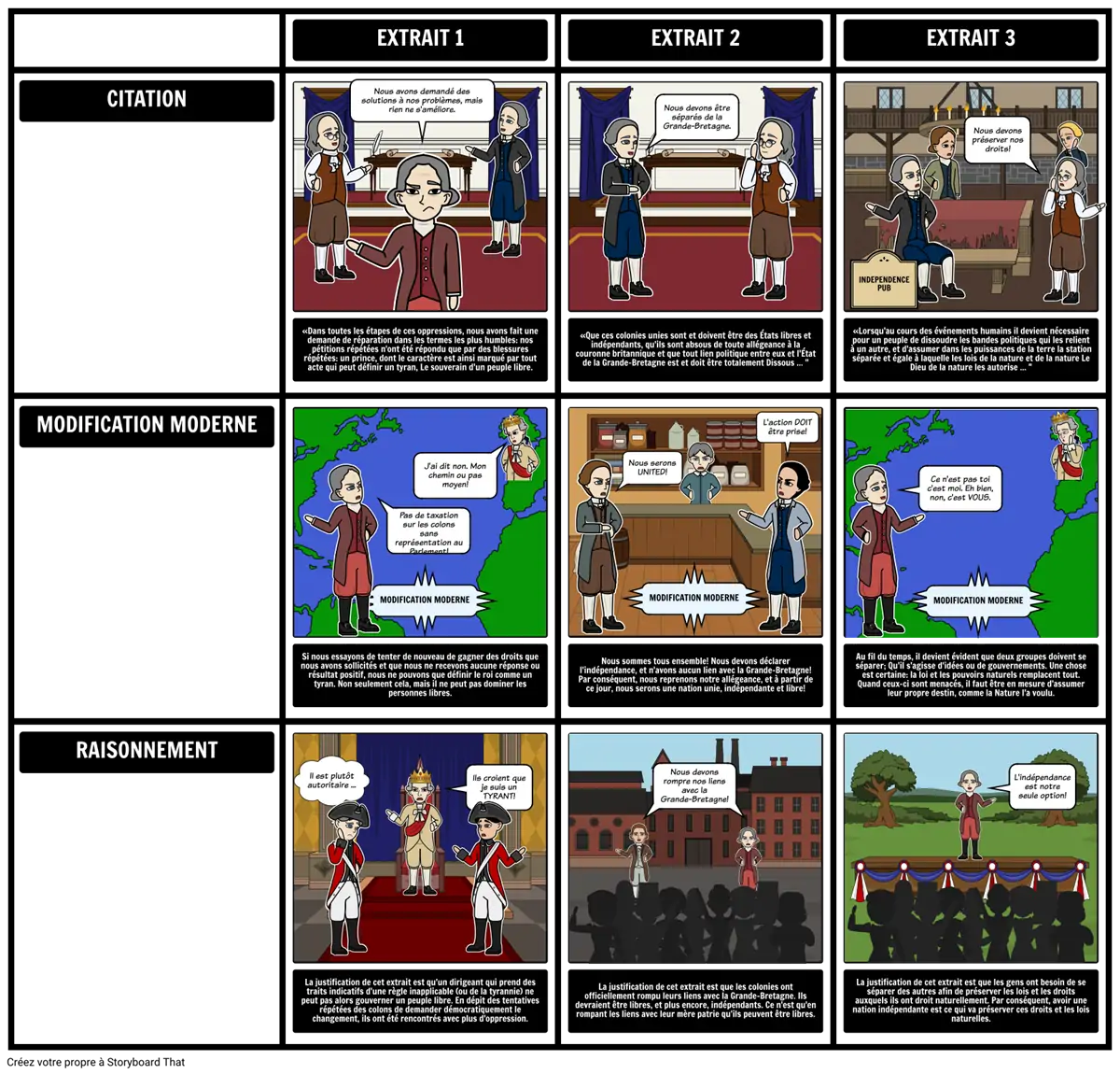 À l'aide d'un story-board en quadrillage, demandez aux élèves d' analyser des extraits du texte de la Déclaration d'indépendance . Demandez aux élèves d'utiliser un axe de la grille pour mettre un extrait spécifique, un pour leur justification sur cet extrait, et enfin ce que cela pourrait signifier dans le «libellé moderne». En utilisant une grille, les étudiants seront en mesure d'analyser et de synthétiser ce qu'ils pensent que la Déclaration dit, ce qu'elle signifie et ce qu'elle pourrait signifier aujourd'hui.