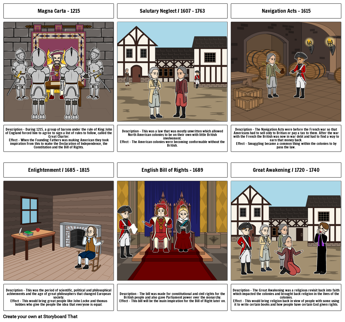Description - During 1215, a group of barons under the rule of King John of England forced him to agree to sign a list of rules to follow, called the Great Charter.Effect - When the Founding Fathers was making American they took inspiration from this to make the Declaration of Independence, the Constitution and the Bill of Rights.