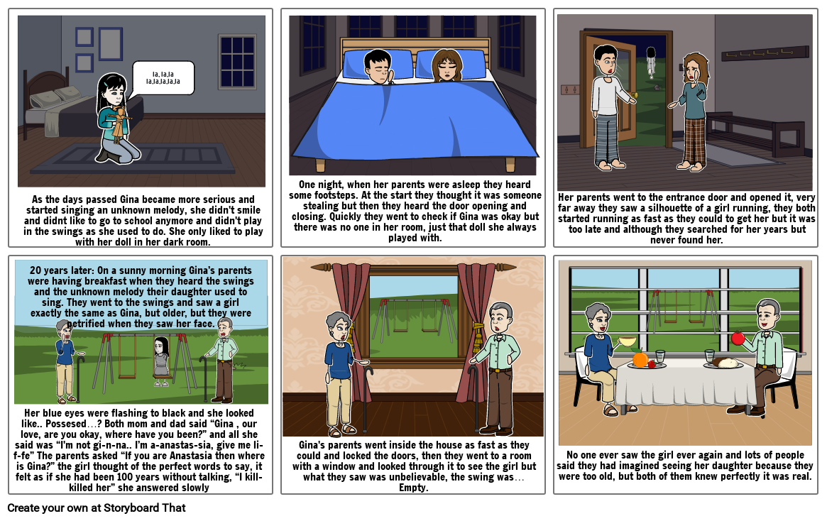 20 years later: On a sunny morning Gina’s parents were having breakfast when they heard the swings and the unknown melody their daughter used to sing. They went to the swings and saw a girl exactly the same as Gina, but older, but they were petrified when they saw her face.