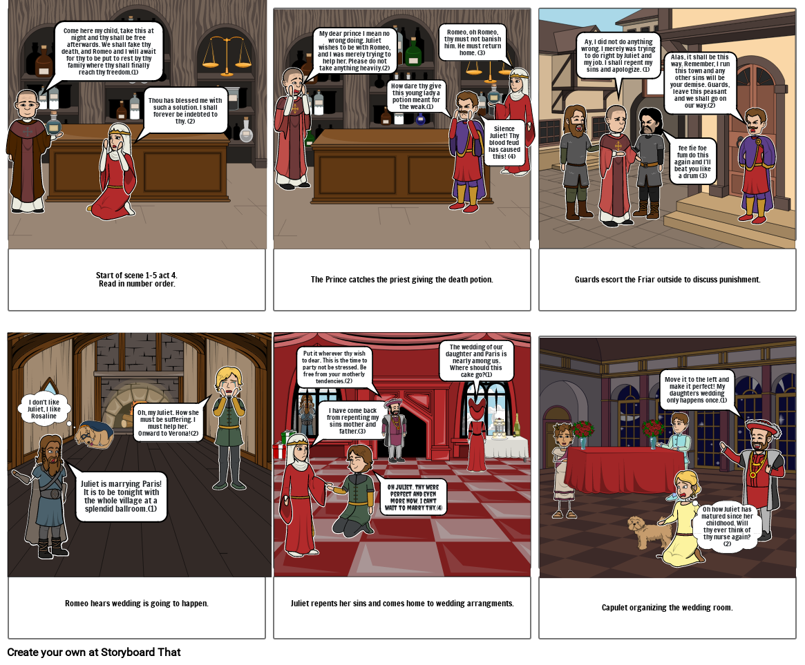 Come here my child, take this at night and thy shall be free afterwards. We shall fake thy death, and Romeo and I will await for thy to be put to rest by thy family where thy shall finally reach thy freedom.(1)