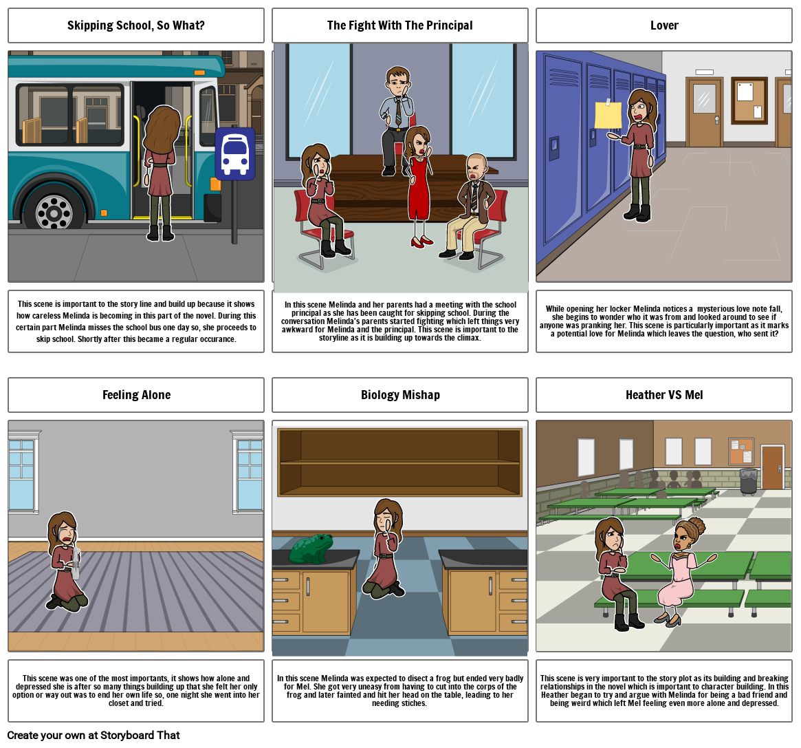 This scene is very important to the story plot as its building and breaking relationships in the novel which is important to character building. In this Heather began to try and argue with Melinda for being a bad friend and being weird which left Mel feeling even more alone and depressed.