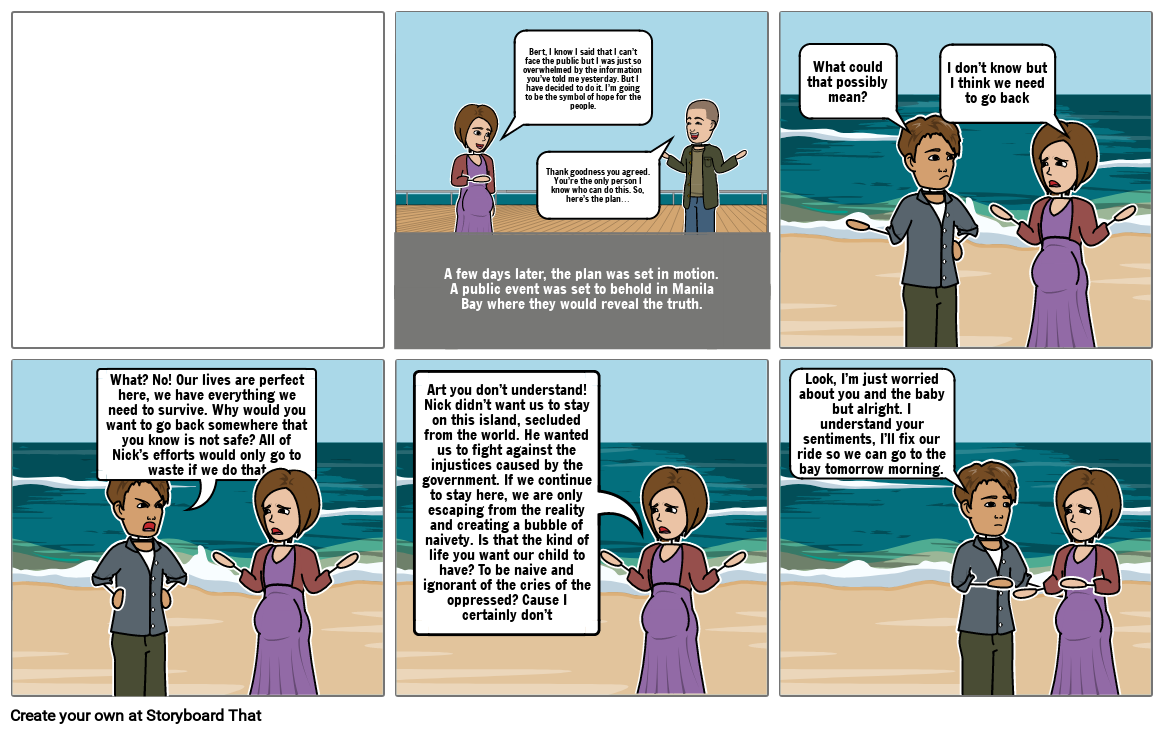 Art you don’t understand! Nick didn’t want us to stay on this island, secluded from the world. He wanted us to fight against the injustices caused by the government. If we continue to stay here, we are only escaping from the reality and creating a bubble of naivety. Is that the kind of life you want our child to have? To be naive and ignorant of the cries of the oppressed? Cause I certainly don’t