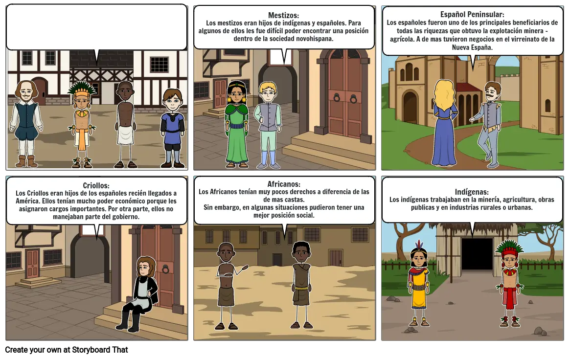 Mestizos:Los mestizos eran hijos de indígenas y españoles. Para algunos de ellos les fue difícil poder encontrar una posición dentro de la sociedad novohispana.
