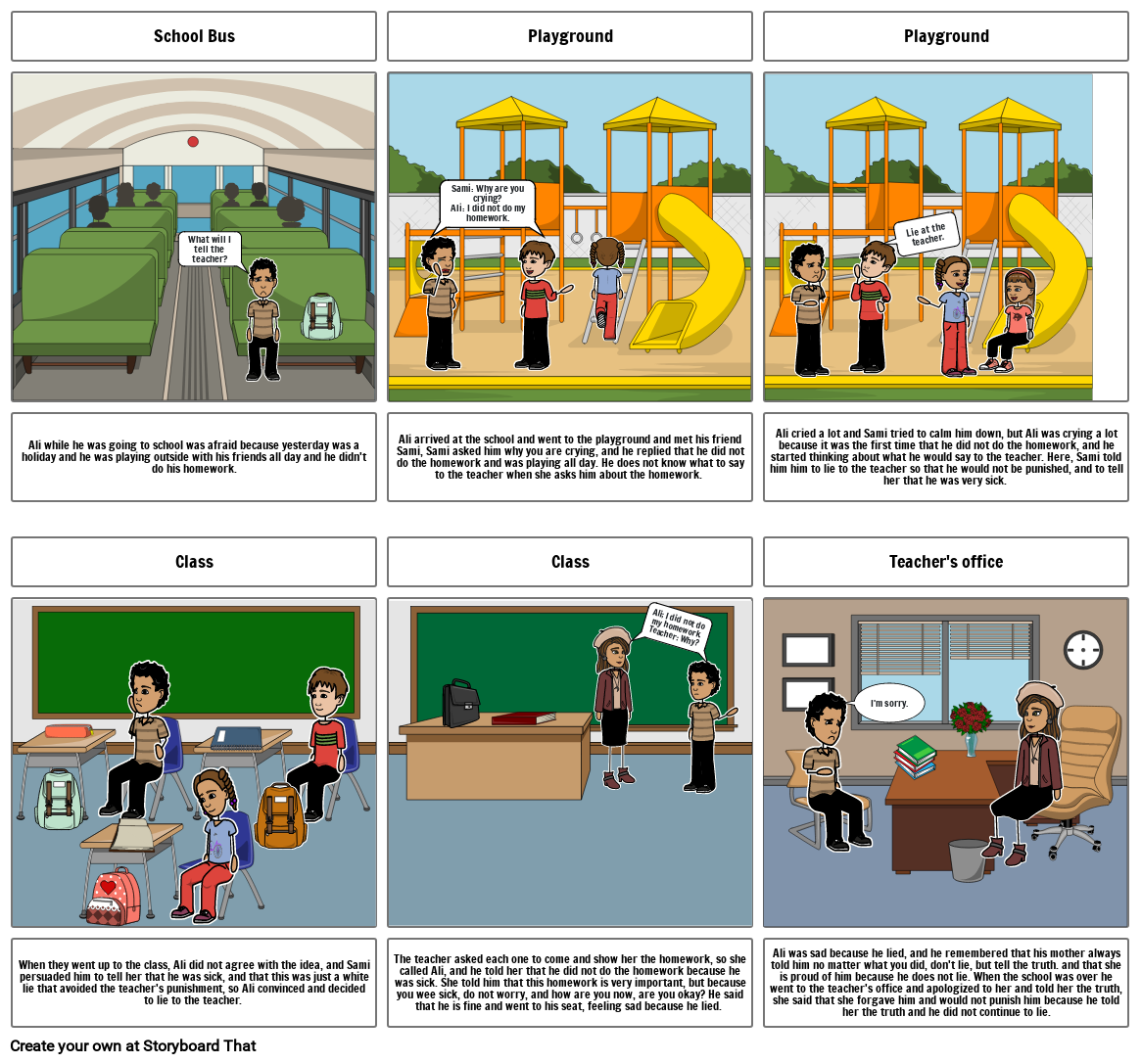The teacher asked each one to come and show her the homework, so she called Ali, and he told her that he did not do the homework because he was sick. She told him that this homework is very important, but because you wee sick, do not worry, and how are you now, are you okay? He said that he is fine and went to his seat, feeling sad because he lied.