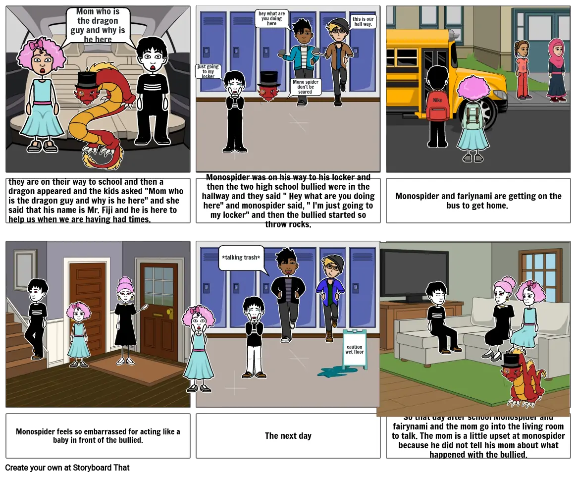 So that day after school Monospider and fairynami and the mom go into the living room to talk. The mom is a little upset at monospider because he did not tell his mom about what happened with the bullied.