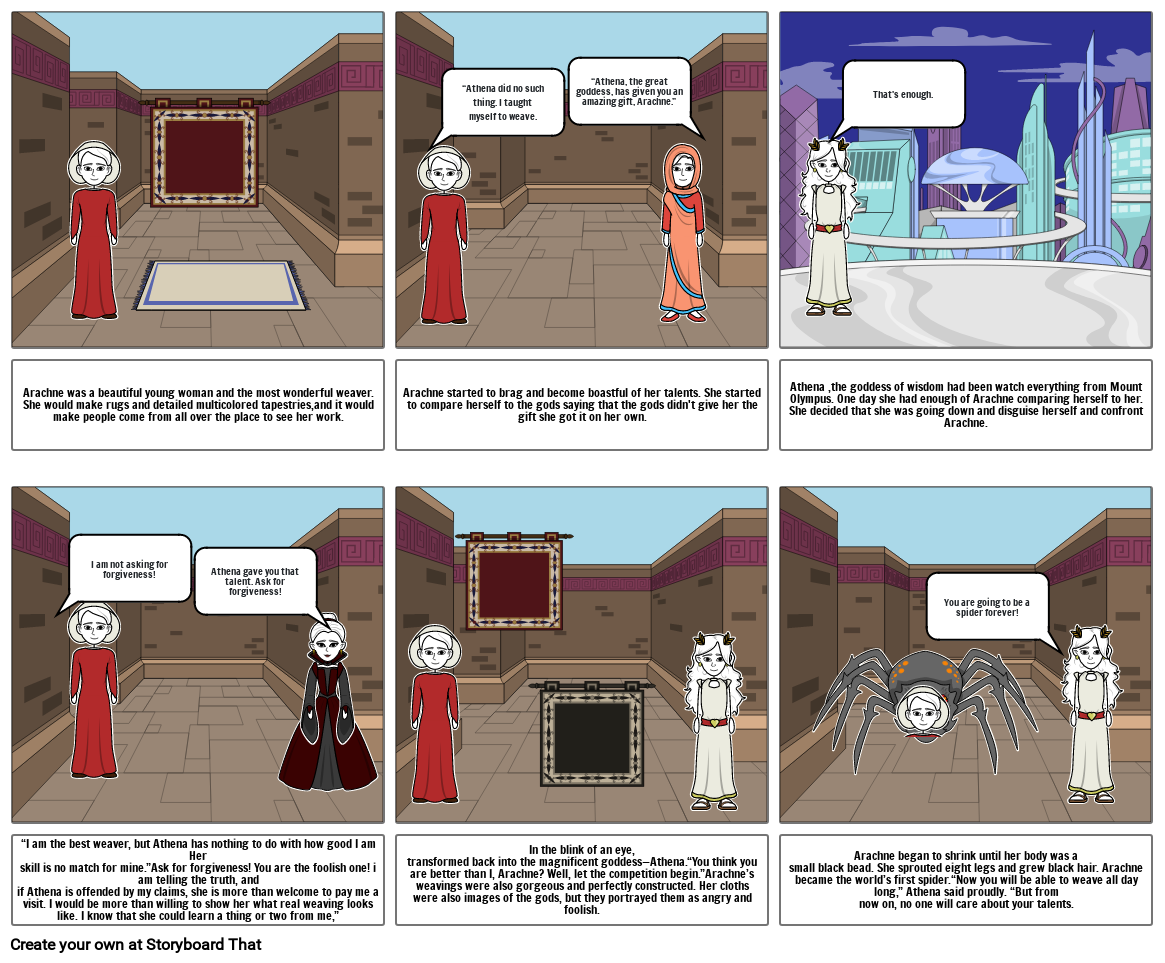 Arachne was a beautiful young woman and the most wonderful weaver. She would make rugs and detailed multicolored tapestries,and it would make people come from all over the place to see her work.