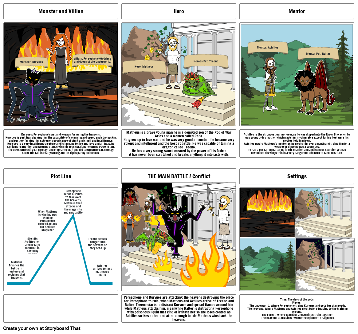Time: The days of the godsPlaces: -The underworld: Where Persephone trains Kurvues and gets her plan ready.-The heavens: Where Matheus and Achilles meet before heading to the training ground.-The Forest: Where Matheus and Achilles train together.- The heavens (Dark Side): Where the epic battle happened.