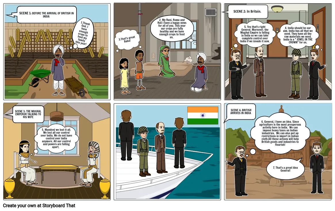 6. General, I have an idea. Since agriculture is the most prosperous activity here in India. We can impose heavy taxes on Indian industries. We can also put up restrictions in import in Indian cloth.All these actions will help British goods and industries to flourish!