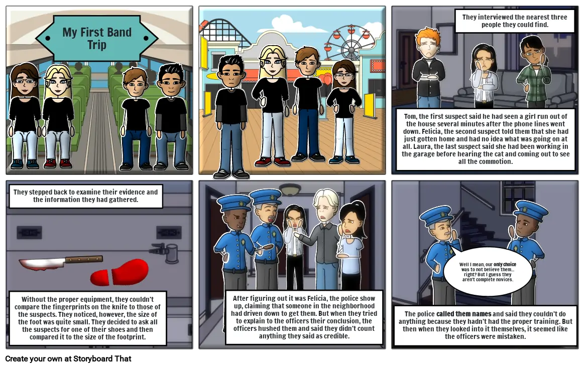 Tom, the first suspect said he had seen a girl run out of the house several minutes after the phone lines went down. Felicia, the second suspect told them that she had just gotten home and had no idea what was going on at all. Laura, the last suspect said she had been working in the garage before hearing the cat and coming out to see all the commotion.