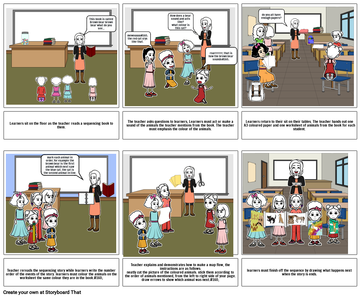 Teacher rereads the sequencing story while learners write the number order of the events of the story. learners must colour the animals on the worksheet the same colour they are in the book.#160;