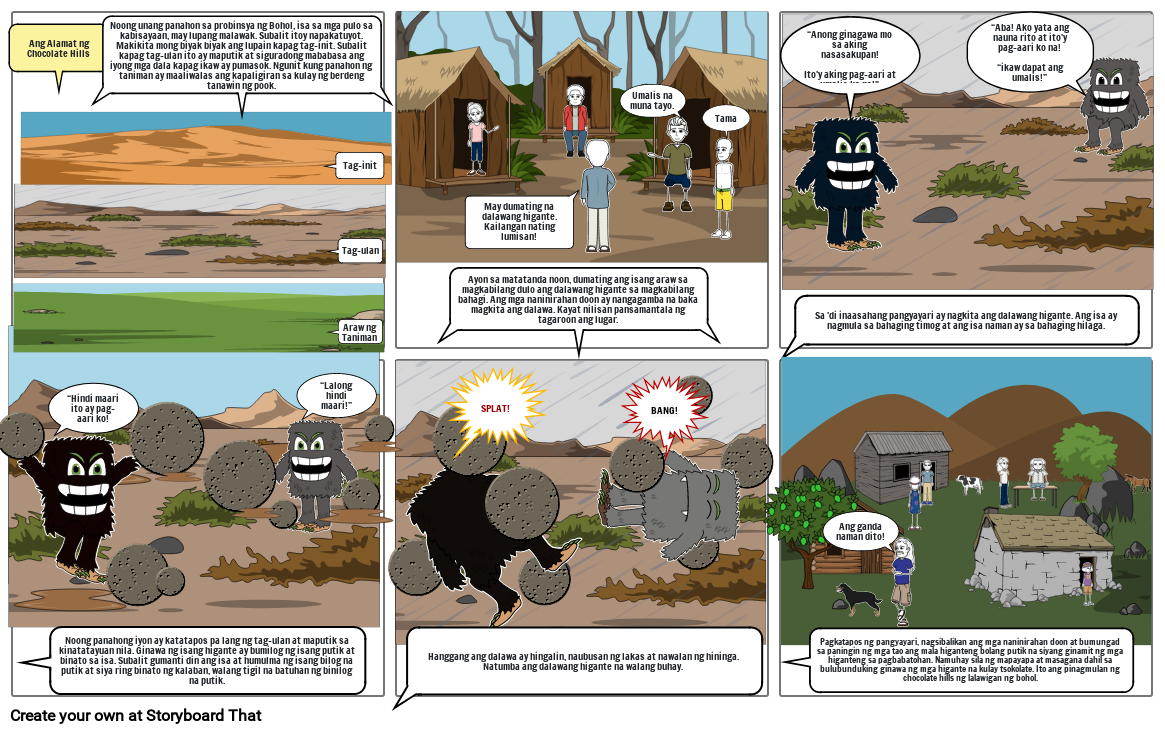Pagkatapos ng pangyayari, nagsibalikan ang mga naninirahan doon at bumungad sa paningin ng mga tao ang mala higanteng bolang putik na siyang ginamit ng mga higanteng sa pagbabatohan. Namuhay sila ng mapayapa at masagana dahil sa bulubunduking ginawa ng mga higante na kulay tsokolate. Ito ang pinagmulan ng chocolate hills ng lalawigan ng bohol.