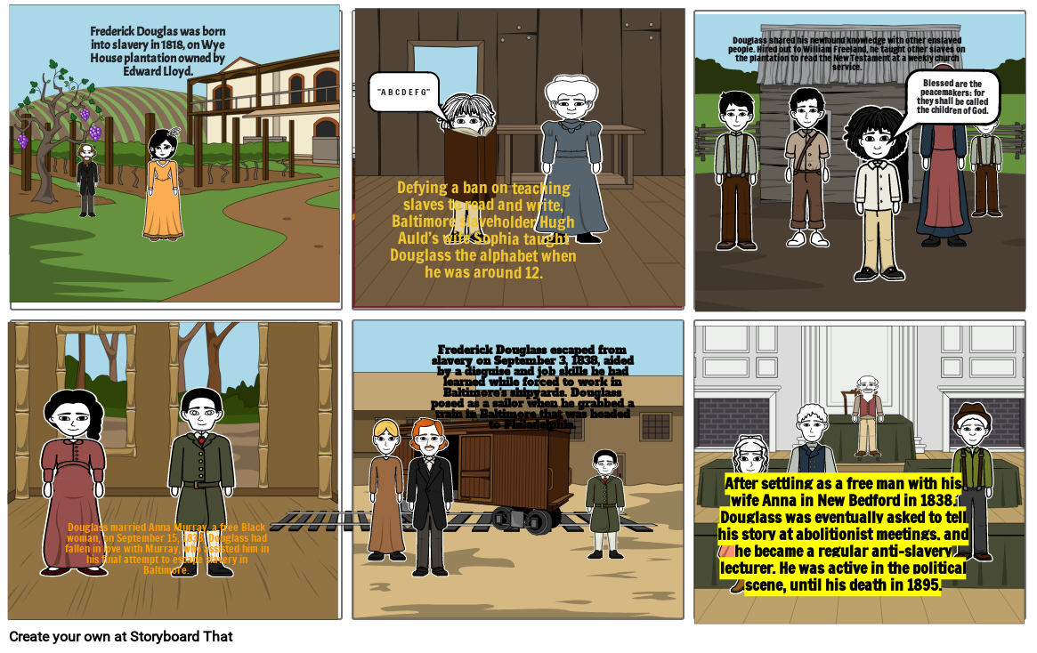 Douglass shared his newfound knowledge with other enslaved people. Hired out to William Freeland, he taught other slaves on the plantation to read the New Testament at a weekly church service.