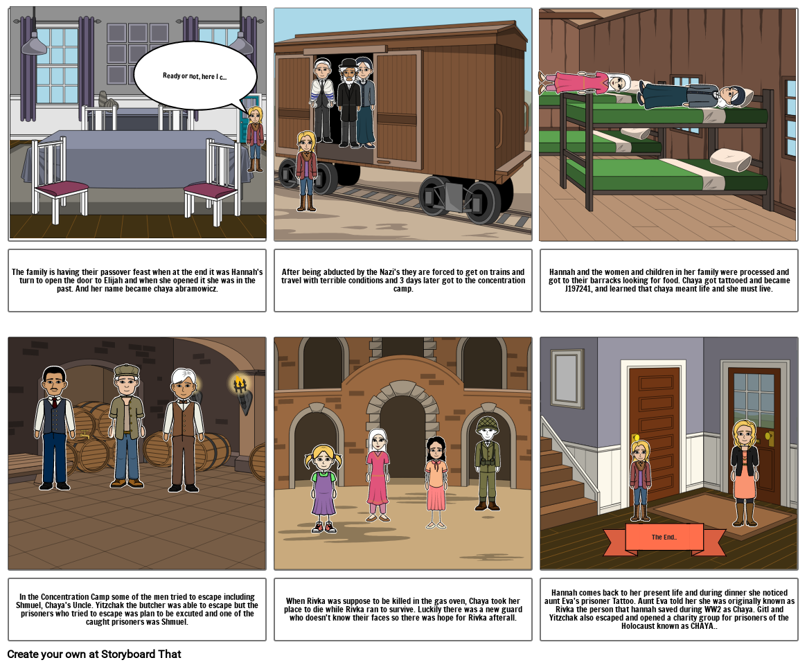 Hannah comes back to her present life and during dinner she noticed aunt Eva's prisoner Tattoo. Aunt Eva told her she was originally known as Rivka the person that hannah saved during WW2 as Chaya. Gitl and Yitzchak also escaped and opened a charity group for prisoners of the Holocaust known as CHAYA..