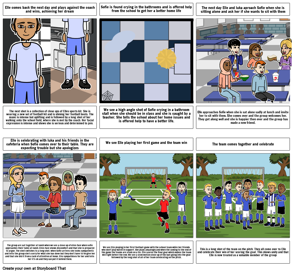 The next shot is a collection of close ups of Elles sports kit. She is wearing a new set of football kit and is shining her football boots. The music is intense but uplifting and is followed by a long shot of her walking onto the school field, where she is met by the coach. Her facial expression is intense and shows she is serious and determined to join.