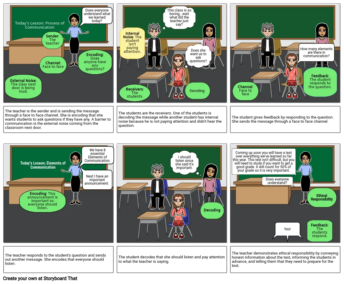 The teacher is the sender and is sending the message through a face to face channel. She is encoding that she wants students to ask questions if they have any. A barrier to communication is the external noise coming from the classroom next door.