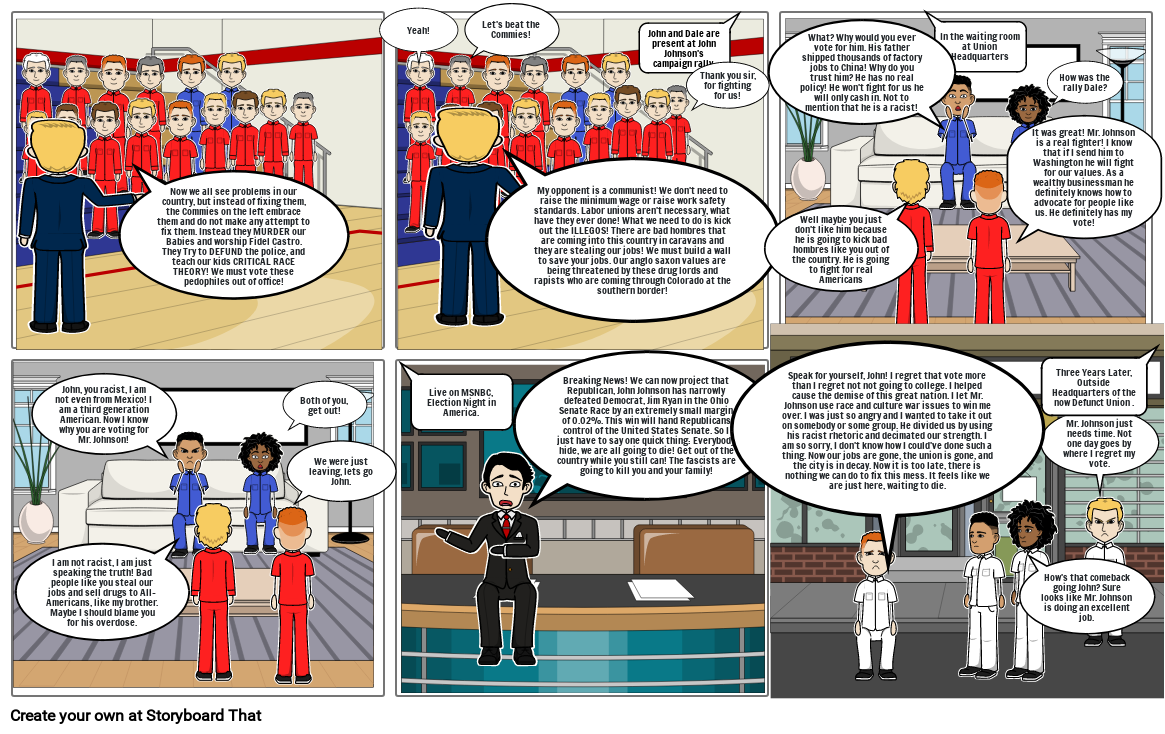 Speak for yourself, John! I regret that vote more than I regret not not going to college. I helped cause the demise of this great nation. I let Mr. Johnson use race and culture war issues to win me over. I was just so angry and I wanted to take it out on somebody or some group. He divided us by using his racist rhetoric and decimated our strength. I am so sorry, I don't know how I could've done such a thing. Now our jobs are gone, the union is gone, and the city is in decay. Now it is too late, there is nothing we can do to fix this mess. It feels like we are just here, waiting to die.